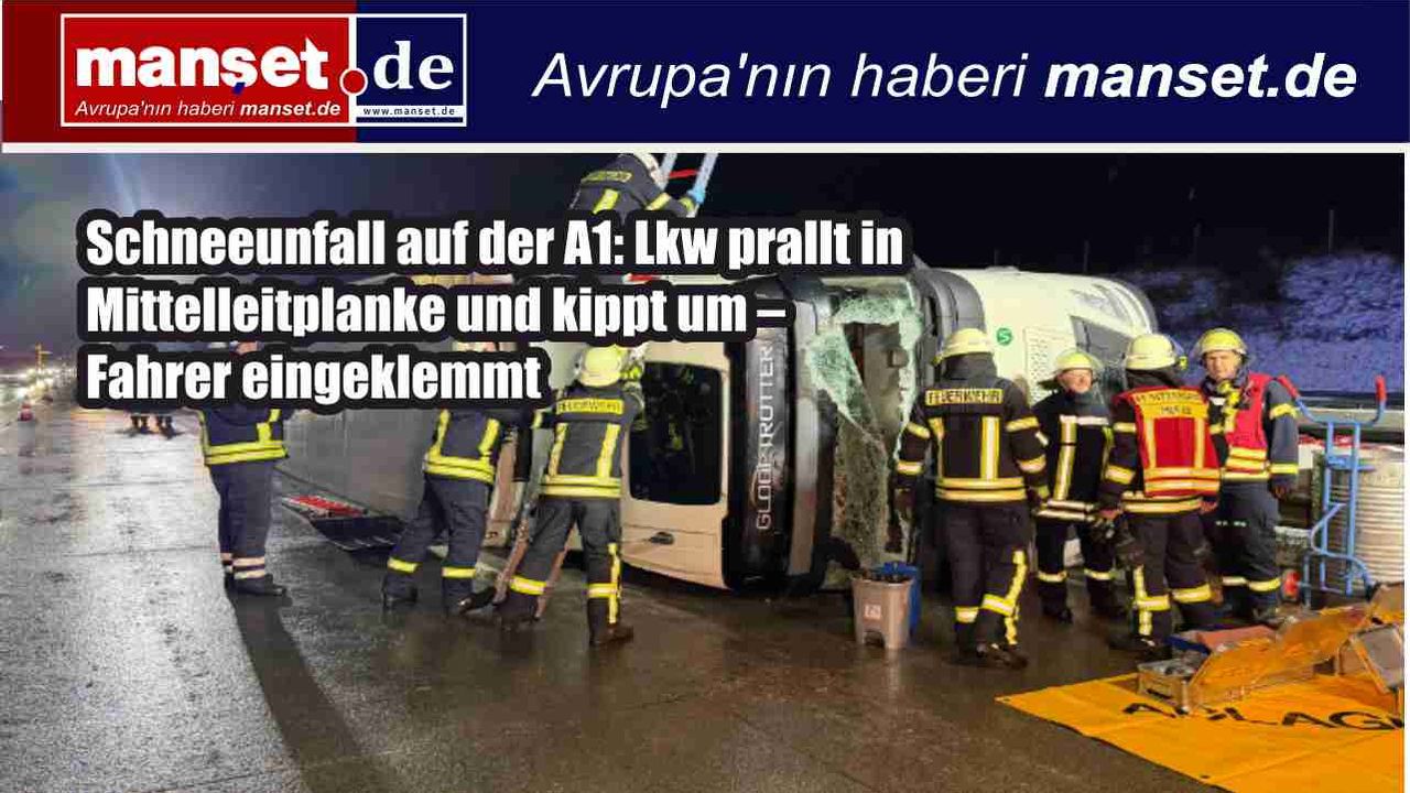 Schneeunfall auf der A1: Lkw prallt in Mittelleitplanke und kippt um – Fahrer eingeklemmt